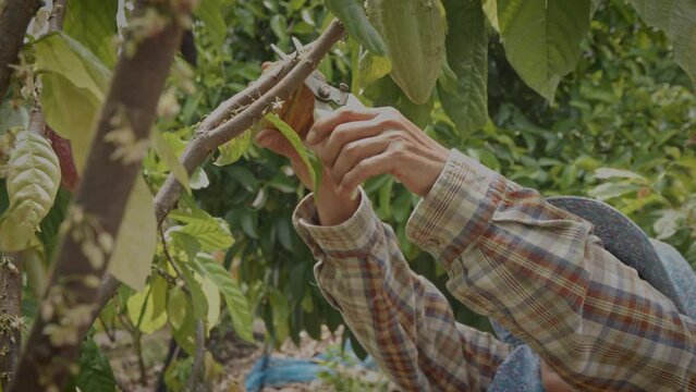 Asian woman farmer use pruning shears cut cacao pod from cacao tree in cacao farm, slow-motion