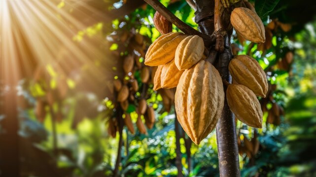 Golden Cacao Pods on the Tree: Sunlit Cacao pods hanging from a tree branch, showcasing the vibrant yellow-orange hue of ripe cacao fruits.