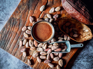 Natural craft cocoa drink, organic healthy chocolate drink with brown cocoa beans and dry cacao pod.Top view,above