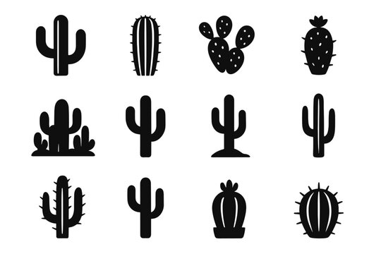 Linear Cacti Icons, Isolated Monochrome Minimalist Representations Of Cactus Plants In A Sleek, Line Art Style
