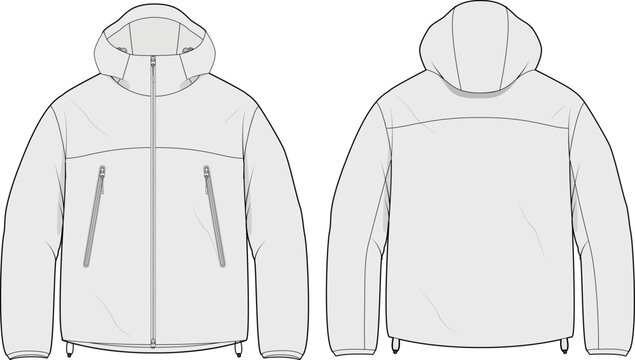 Unisex hoodie zip-up sweatshirt flat sketch front and back, fashion technical drawing template, apparel CAD design vector, garment mockup outline illustration.