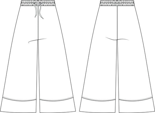 Women’s wide leg pants technical flat sketch, fashion trousers front view, vector CAD drawing for apparel design and garment production