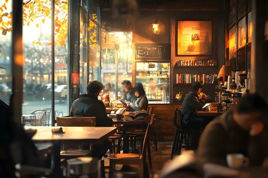 Cozy urban cafe ambiance with people working and relaxing indoors