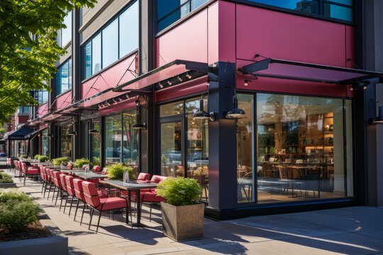 Outdoor dining area with red umbrellas at a street side cafe