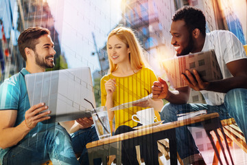 Sharing ideas. Clever experienced cheerful colleagues sitting in a lovely cafe and looking interested while discussing their new amazing projects and comparing ideas