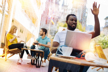 Calling waiter. Cheerful young handsome man sitting in a comfortable cafe with a modern laptop on his knees and raising his hand while calling a waiter