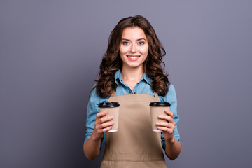 Smiling barista- girl giving take away coffee cups to a customers.