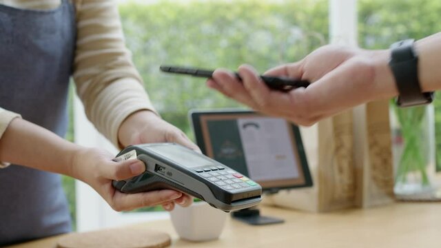 Close-up hand asia woman people work in small sme coffee cafe shop store owner use cashless wifi qr code nfc scan app smart pos reader sale in take out food drink order in urban city life contactless.