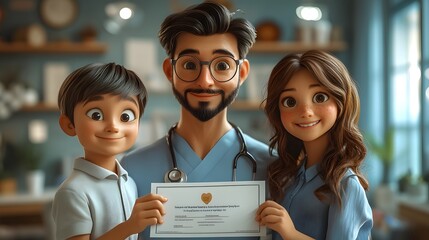 A 3D depiction of a doctor explaining the benefits of vaccination to a couple with their child, who sits on a high examination table in a brightly lit, clean hospital room.