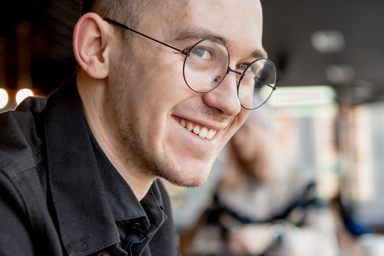 Young stylish man enjoys a cake and a drink while sitting in a cafe with large windows