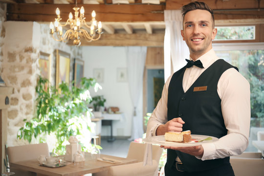 cherry filled clafoutis on a table in a cafe with bright and modern interior elements. French dessert. Concept restaurant menu, culinary blog, social media, national dishes