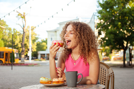 young attractive curly woman sits at table in cafe on summer terrace. Colorful delicious donuts, sweet pastries. Good mood, smiling. Rest, snack break. funny eats