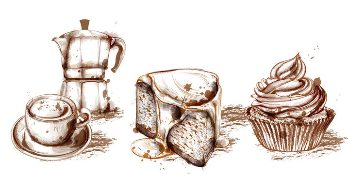 Menu card template drinks and cakes Vector. Fresh coffee, cupcakes, design line arts
