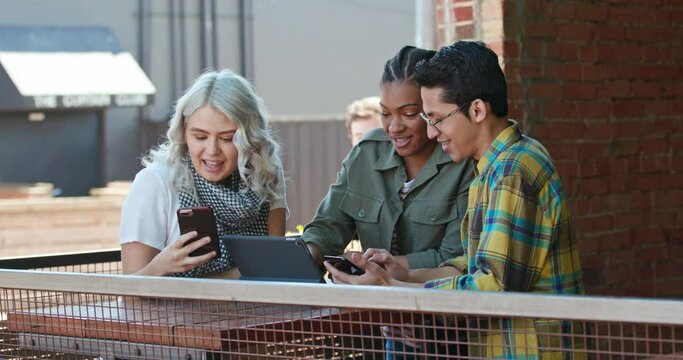 Group of young people working on a digital tablet at an outdoor cafe.
