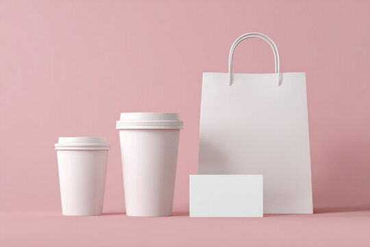 a high quality mockup image:  set of blank cafe items( coffee cup, paper shopper bag, business card) with modern  minimalist background. best use for branding and building a visual identity for cafe,