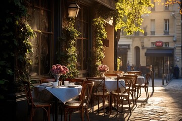 Cozy street with tables of cafe in Paris, France