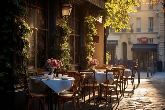 Classic Paris street scene featuring quaint cafe tables in the heart of France.