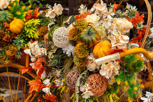 Retro bike with autumn decor. Flower arrangement of artificial plants and pumpkins