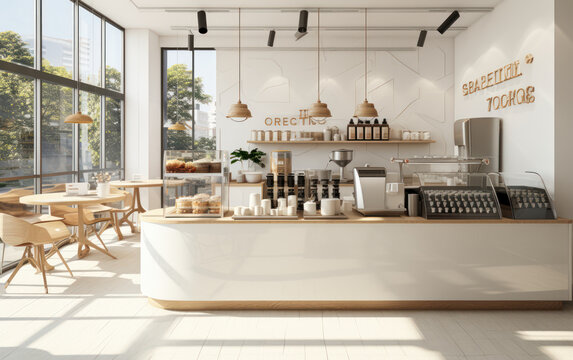 A modern and stylish coffee shop interior with sleek furniture, industrial lighting, and textured concrete walls. AI generated