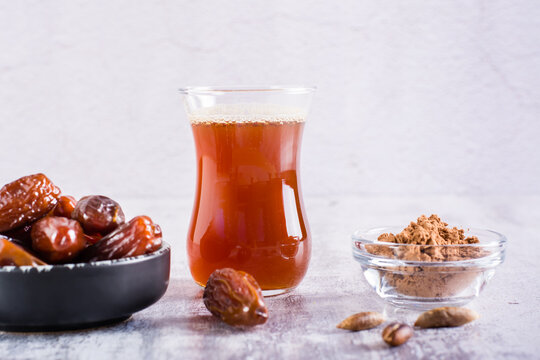 A cup of coffee from ground date seeds on the table. Coffee alternative, caffeine avoidance