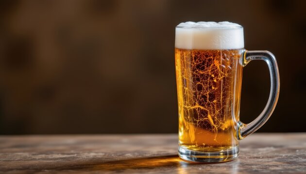 Frothy Mug of Golden Beer With Bubbles on Wooden Table in Cozy Bar Setting