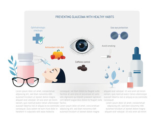 Infographic illustrating glaucoma prevention through eye drops, promoting healthy habits like regular checkups, antioxidant-rich foods, caffeine control, and smoking avoidance