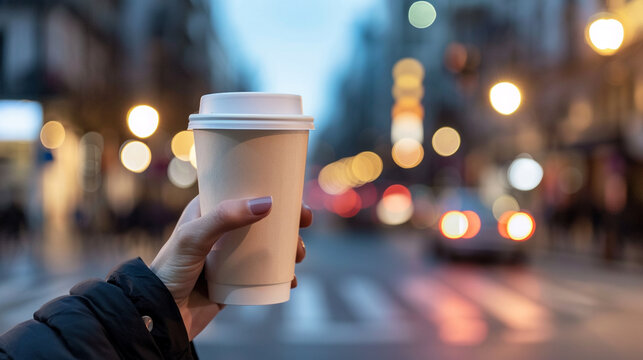 Hand holding disposable coffee cup, city street rush backdrop. Urban lifestyle, caffeine fix for busy commuters. Modern daily convenience. Travel-themed designs, branding material