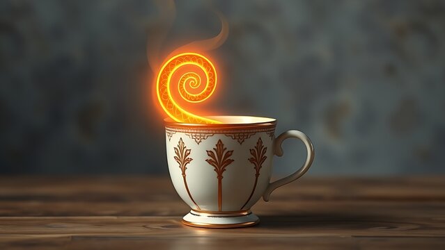 Vintage coffee cup with an infinite glowing spiral, symbolizing longevity and ritual.
