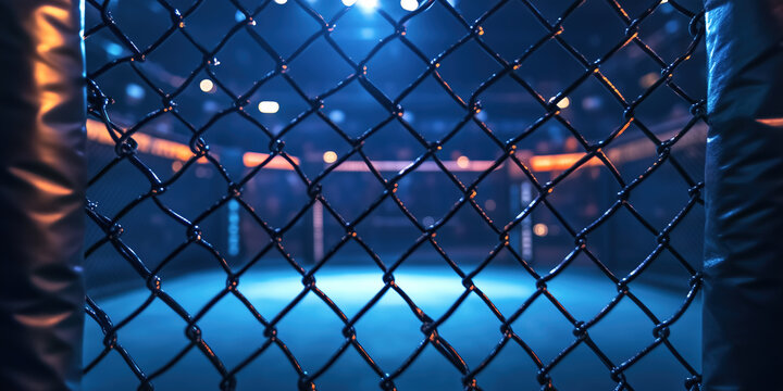 Close-up of the fence of an MMA octagon with blue background. The ring is empty and illuminated.