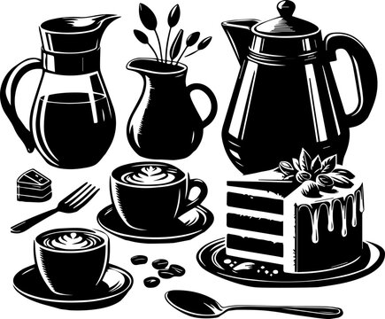 Bakery desserts cake, croissant, coffeepot and coffee cup linear style silhouette drawing with color on white background
