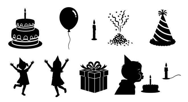 Black silhouette vector set featuring a birthday theme including cake, balloon, candle, confetti, party hat, gift, and happy children.