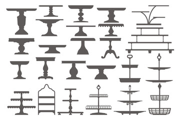 Set of cake stands in flat icon style. Empty trays for fruit and desserts. Vector silhouette.