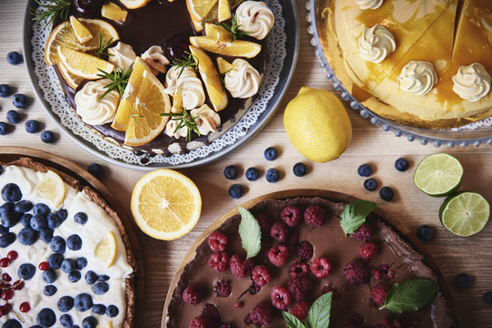 Three different layered frosted miniature cakes close up decorated with berries in a cafe or patisserie, blurred background
