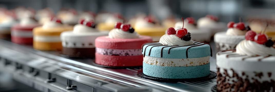 Colorful cakes displayed on a conveyor belt in a bakery during the day while showcasing elaborate decorations and various flavors