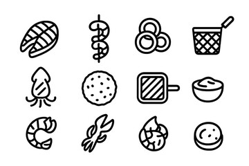 Seafood Icon Set. Outline icon set of grilled and fried seafood: fish fillet, shrimp skewer, calamari rings,