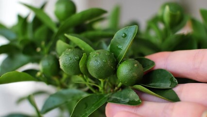Citrofortunella microcarpa. tree calamondin in a pot at home. Natural background with calamondin young green immature fruit in foliage. houseplant care. female hand touching a plant
