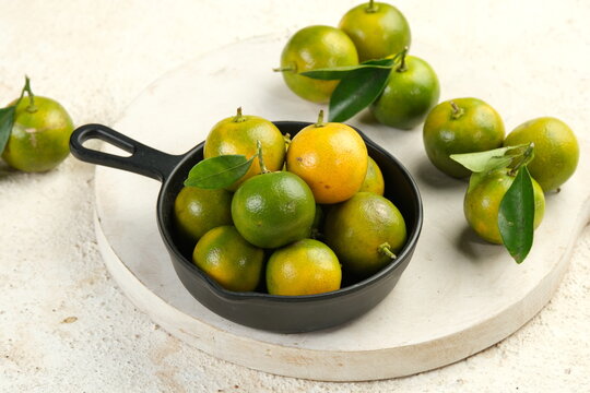 Organic young and unripe fruits of Calamansi or kalamansi AKA calamondin or Philippine lime. This food aids digestion and weight loss. Copy space. Selected focus.