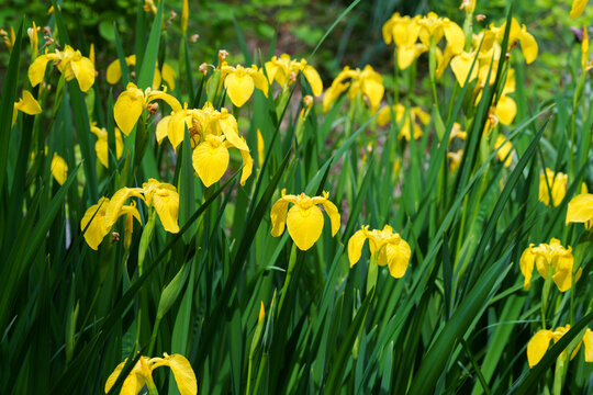 Landscape with yellow Japanese water iris (Acorus calamus L.) flowers blooming in early summer