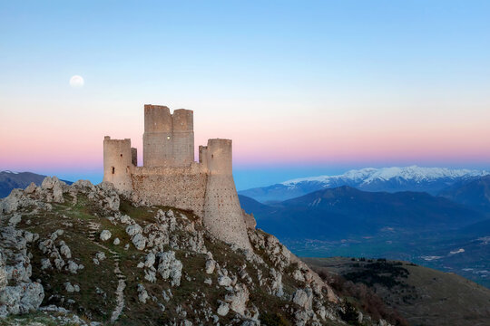 Ruins of medieval castle of Rocca Calascio after sunset and moon rising with mountain landscape and colorful sky in background, Abruzzo, Italy