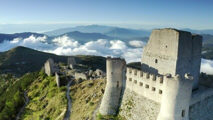 Rocca Calascio, an ancient Italian castle. Old castle in ruins, perched on the rocks of the Abruzzo mountains in Italy. Evocative and fantastic place