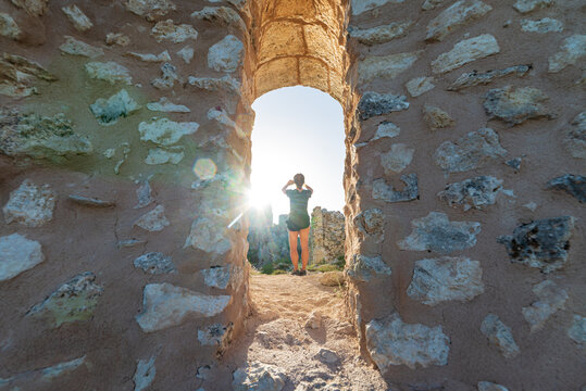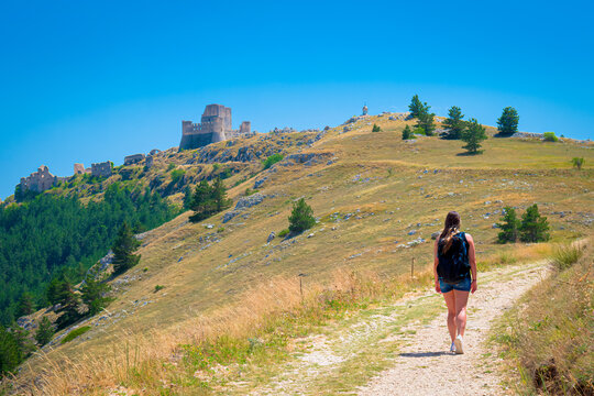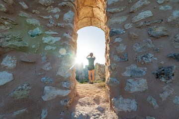 Woman selfie at castle ruins on mountain top at Rocca Calascio, italian travel destination, landmark in the Gran Sasso National Park, Abruzzo, Italy. Clear blue sky sun burst in backlight