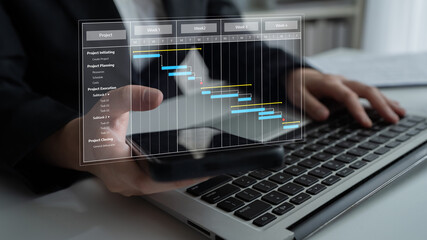 A business professional reviews a project timeline displayed on a smartphone and laptop, illustrating modern project management techniques in an office setting. Tessel