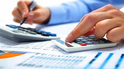 07231249 117. High-detail image capturing the hands of a bookkeeper during bookkeeping tasks, focusing on a calculator, balance sheets, and financial reports, with attention to detail in the