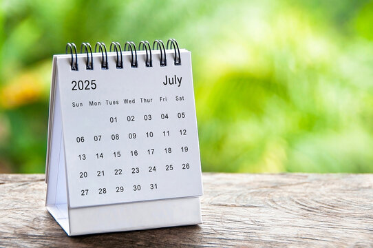 June 2025 desk calendar on wooden table with gold light bokeh background.