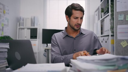 A busy businessman handles document work and takes a smartphone call in a messy office while feeling overworked