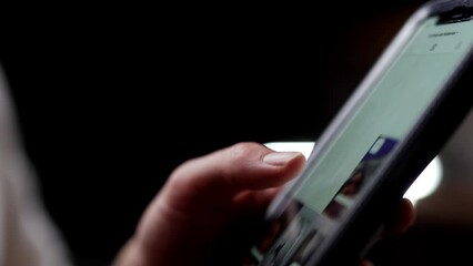 Finger of male touching scroll page app on mobile smartphone device. Browsing movie video sharing photos on social media using 5g internet connection