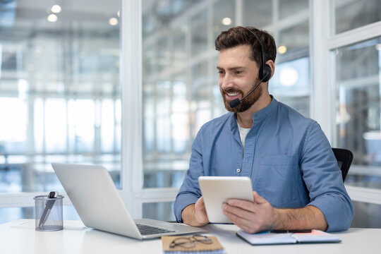 Happy bearded man wearing a headset and working remotely from an office, providing online customer support and technical assistance while looking at a laptop screen and holding a digital tablet
