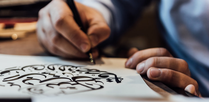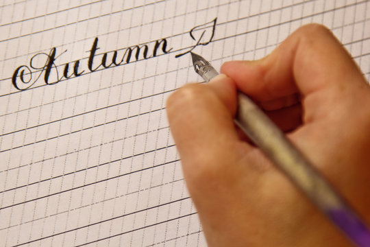 female hand writes with the inky pen the word autumn on a white paper sheet with stripes. stationery on desk close up top view. spelling lessons and caligraphy exercises. Template, layout, background