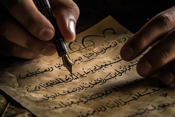 calligrapher writes arabic lettering with calligraphy pen on parchment. macro shot of islamic calligraphy art. close up shot