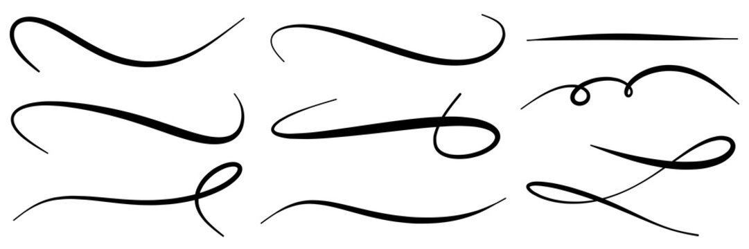 Set of vintage calligraphic flourish, curls, dividers, scrolls and swirls. Simple design elements. Hand drawn flourish vector collection.